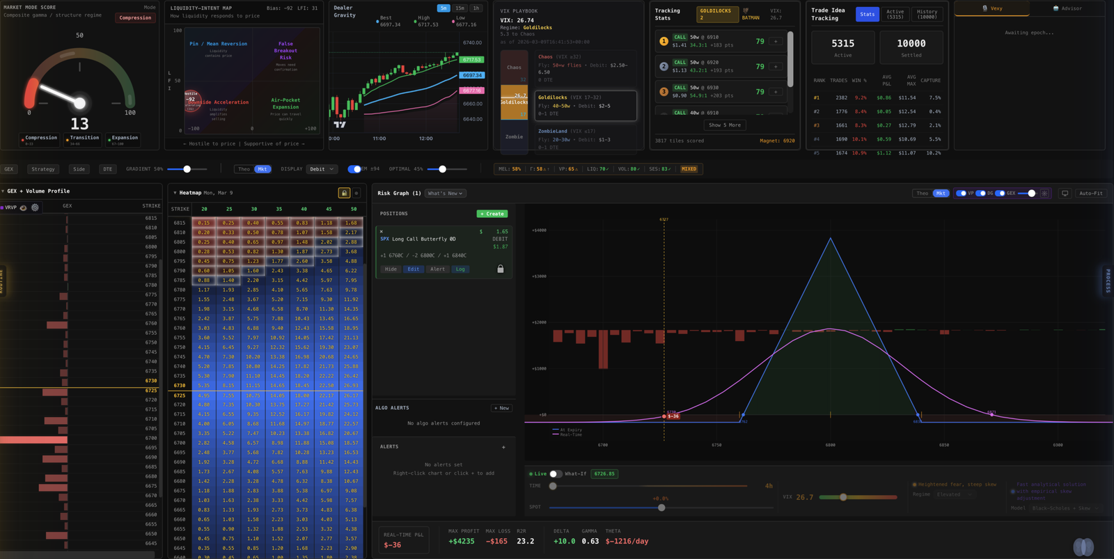 GEX + Volume Profile before the open. Convexity Heatmap scoring every strike. Risk Graph with What-If before you commit. Vexy reading your patterns before you repeat them. Nothing gated. Nothing held back. The only difference between tiers is how close you get to Ernie.